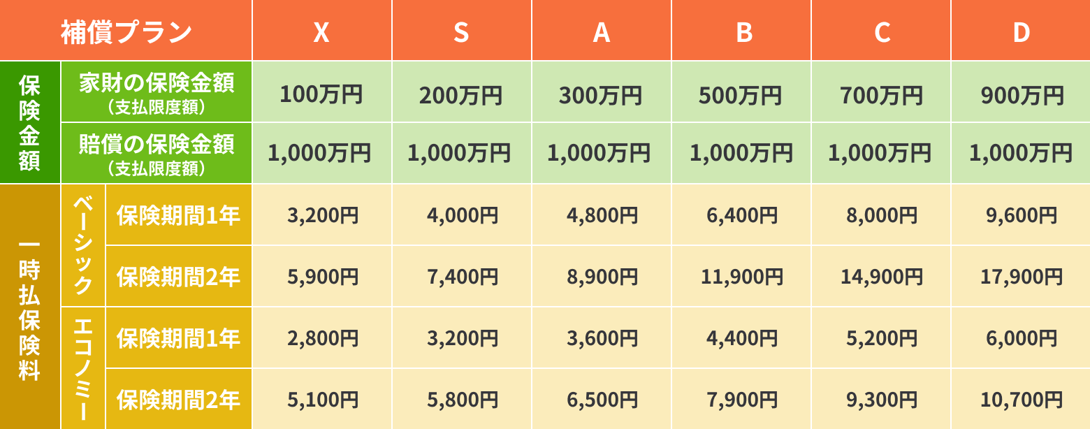※賠償の保険金額は、「借家人賠償」と「個人賠償」合算で1,000万円となります。